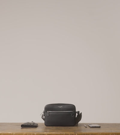 Camera bag marqué Le Tanneur avec porte-badge amovible et éléments métalliques finition argent. Porté main, épaule ou croisé grâce à sa bandoulière ajustable et amovible.